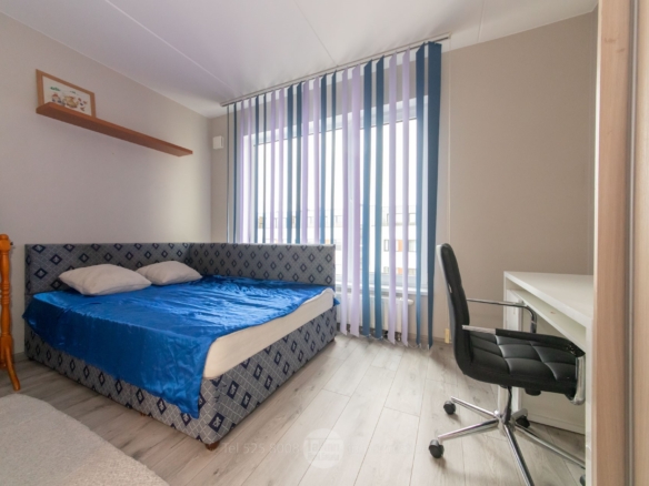 Magamistuba: suur voodi, kapp ja arvutilaud