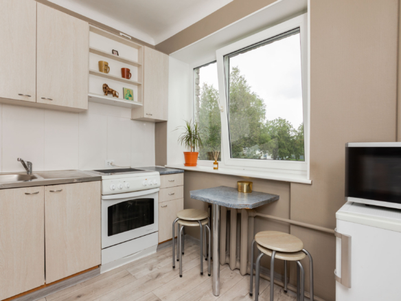 Köök: köögimööbel, külmkapp, pliit ja mikrolaineahi, laud ja toolid.