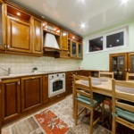 На кухне – кухонная мебель с техникой (холодильник, плита, вытяжка и микроволновая печь), стол и стулья