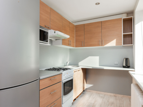 Жилая комната с открытой кухней: кухонная мебель с техникой, стол, стулья, диван, комод, стол под тв и телевизор.