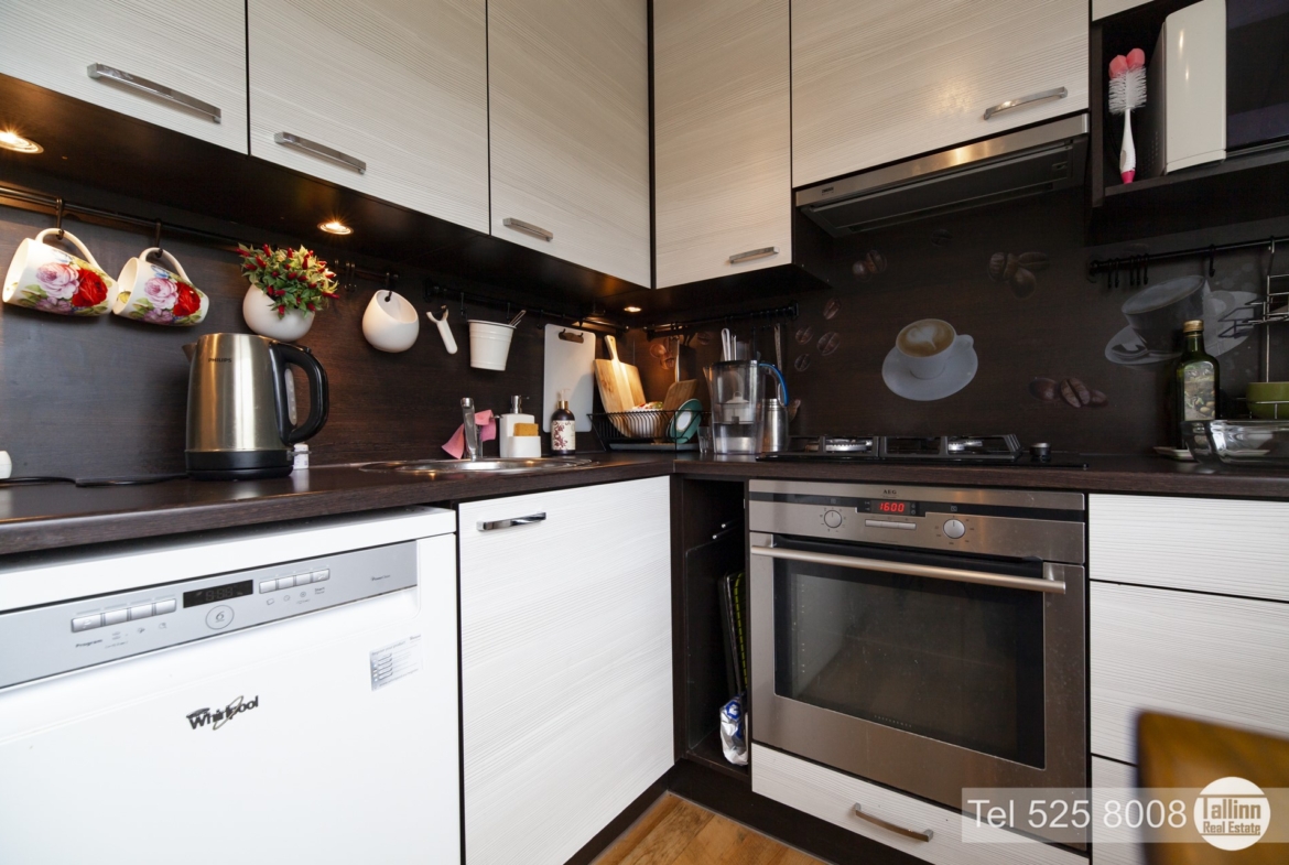Köögis – köögimööbel, külmkapp, pliit, ahi, kubu, mikrolaineahi, nõudepesumasin, laud ja toolid