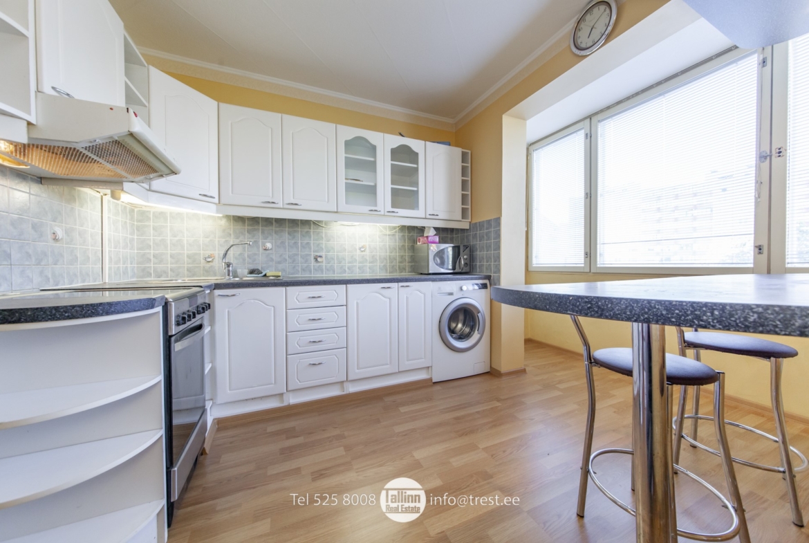 Köök – köögimööbel kogu eluks vajaliku tehnikaga (külmkapp, pliit, ahi, õhupuhastaja ja pesumasin), söögilaud ja toolid