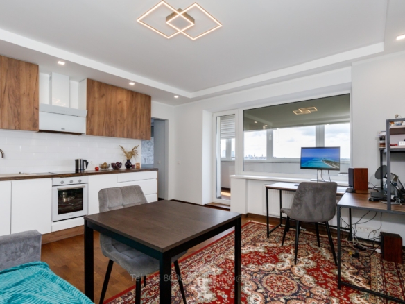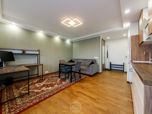 Elutuba avatud köögiga: köögimööbel koos tehnikaga, laud, toolid, arvutilaud ja diivan-voodi.